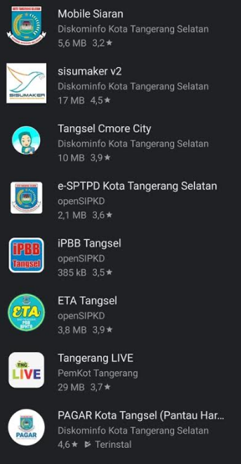Jika Anda sempat membuka playstore, disitu akan terlihat beberapa aplikasi milik pemkot ini. Antara lain Mata Tangsel, Tangsel Cmore City (direktori Kota Tangsel), Sisumaker (system surat masuk dan keluar), Tangsel messenger (aplikasi messenger).