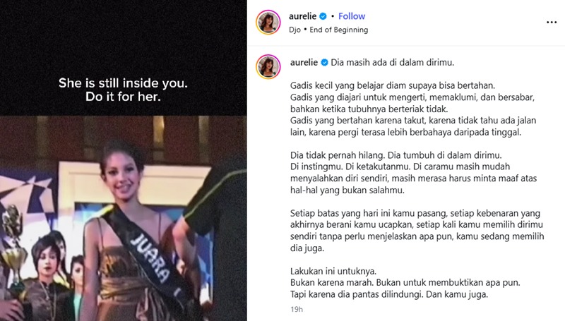 “Dia masih ada di dalam dirimu. Setiap batas yang hari ini kamu pasang, setiap kebenaran yang akhirnya berani kamu ucapkan, setiap kali kamu memilih dirimu sendiri tanpa perlu menjelaskan apa pun, kamu sedang memilih dia juga,” tulis Aurelie Moeremans, dikutip Kamis (15/1/26).